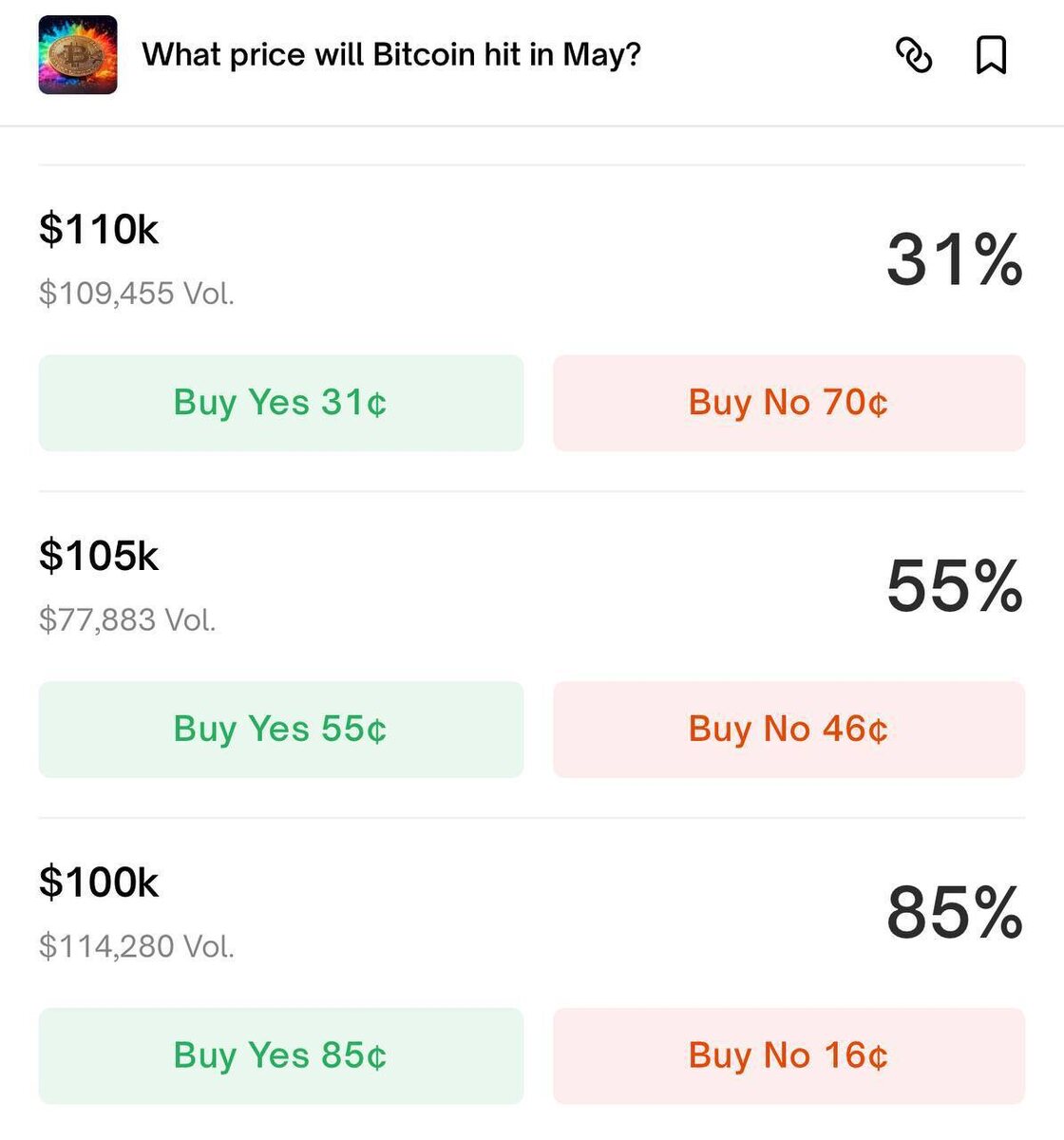 🔸Согласно прогнозам пользователей платформы Polymarket, существует 85% вероятность того, что цена биткоина превысит $100 000 в текущем месяце.