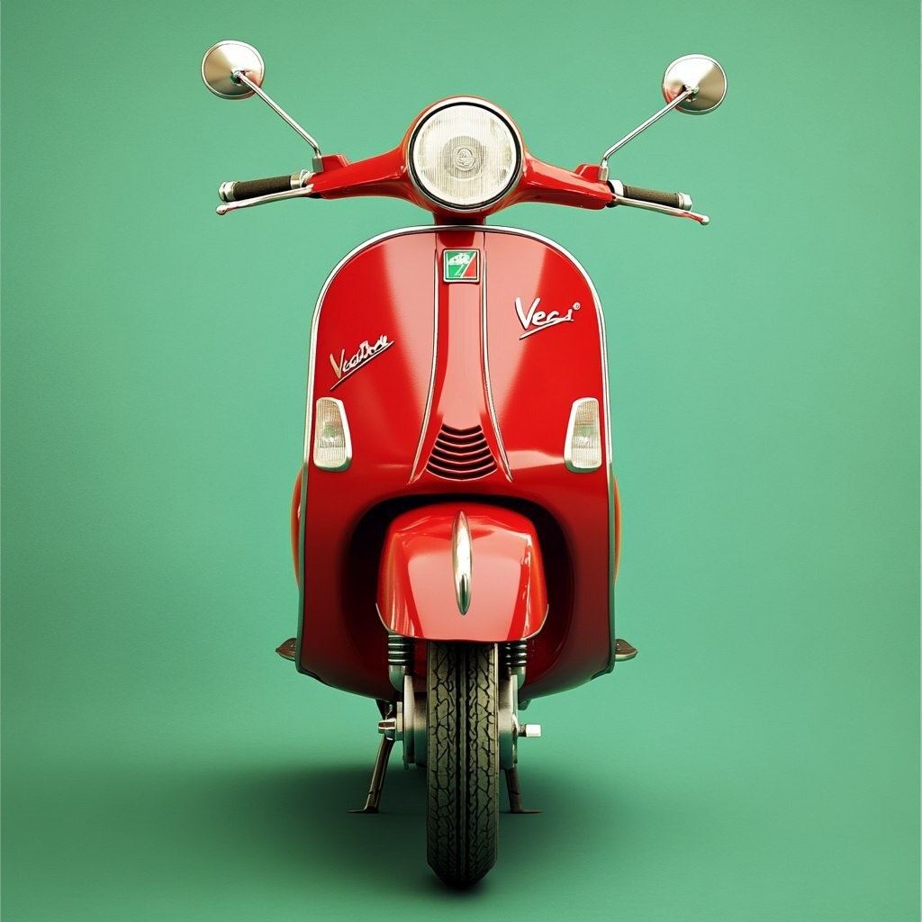 Создано на основе запроса: a red vintage Vespa scooter, front view, centered, isolated on green background, dramatic lighting, high detail