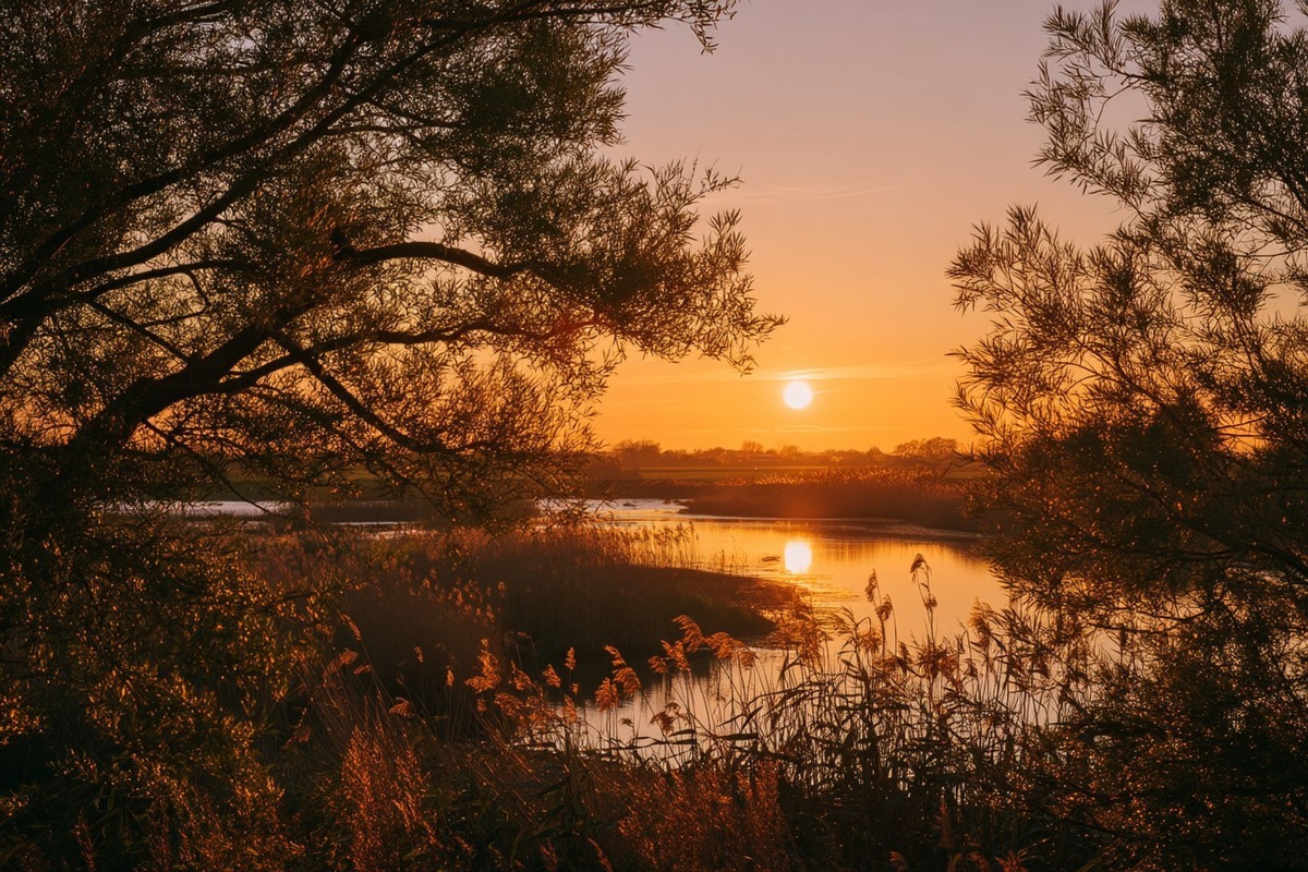 Создано на основе запроса: Golden hour sunset over a tranquil landscape, warm orange and amber hues, shot with a Fujifilm xt20 and a