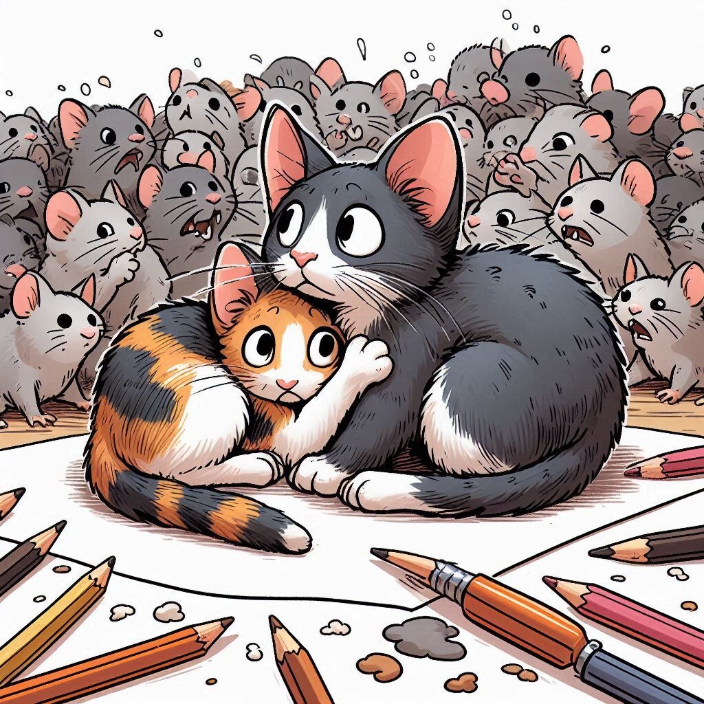 Дрожа от страха, кошки начали медленно приближаться к спящей крысе. Каждый шаг казался вечностью. Лес вокруг них, казалось, затаил дыхание. Ветви деревьев угрожающе нависали над ними, словно готовые схватить в любой момент. Где-то вдалеке ухнула сова, заставив кошек вздрогнуть.