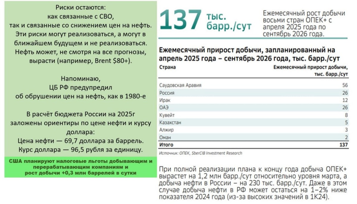 3 мая прошло заседание ОПЕК Договорились увеличить добычу нефть на 411 тыс. баррелей в сутки в июне Предварительно, 18 месяцев подряд, с апреля 2025г по сентябрь 2026г., ОПЕК планировали увеличивать добычу на 137 баррелей в сутки. Фактически, в апреле +411 тыс. баррелей в сутки. В мае тоже планируют увеличить на 411 тыс. баррелей в сутки. Увеличение добычи второй раз подряд пролоббировала Саудовская Аравия (страна с самой низкой в мире себестоимостью добычи нефти, $20)