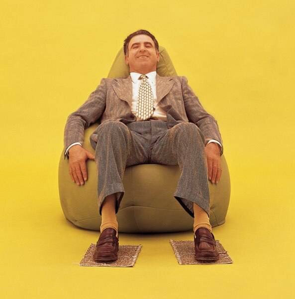 В 1954 году итальянец Аурелио Дзанотта открыл мебельную фабрику, которая на протяжении многих лет выпускала простую и надежную мебель.Только вот сам Аурелио был совсем не простым человеком, а наделенным и хорошей интуицией, и креативностью. Именно поэтому, когда в 1966 году к нему обратились трое молодых энтузиастов с предложением воплотить свою идею, он согласился и не прогадал. Пьеро Гатти, Чезаре Паолини и Франко Теодоро придумали бесформенное кресло-мешок, заполненное миллионами полистироловых шариков и принимающее форму тела сидящего человека. Много фабрик им уже отказало в воплощении идеи, а вот Дзаннота сразу разглядел в идее новый тренд и согласился на сотрудничество. Так кресло Sacco, что в переводе значит мешок, стало ультрапопулярным. Сегодня это икона неформального итальянского дизайна. А на фото сам Аурелио удобно расположился в кресле (только посмотрите на эти эти маленькие коврики!). В своей концепции молодые дизайнеры опирались на самые простые крестьянские матрасы, кот