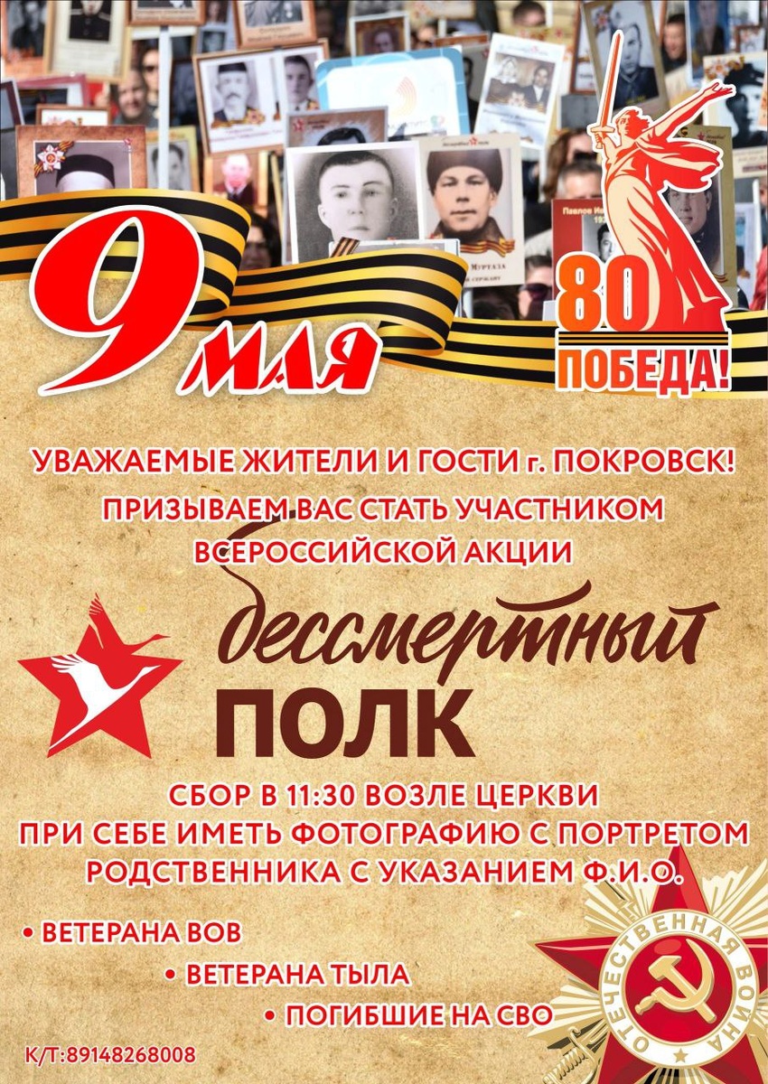 Уважаемые жители и гости города Покровска! 9 мая приглашаем вас принять участие во Всероссийской акции - шествии «Бессмертный полк»! Каждый год, празднуя радостный и светлый День Победы, мы собираемся в колонны «Бессмертного полка», чтобы ушедшие от нас участники войны, победившие фашизм в далеком сорок пятом году, все, кто трудился в тылу и сражался в зоне специальной военной операции, снова вернулись в строй, в каждый дом, в каждую семью. 👥Все желающие могут принять участие в акции-шествии и пройти в колонне «Бессмертного полка» с портретом своего героя \ указать ФИО родственника. Акция состоится 9 мая . Сбор в 11:30 у Храма в честь Покрова Божией Матери в г. Покровск (ул. Орджоникидзе). 📲Справки по телефону: 8914-826-80-08, Сергей. https://t.me/gorod_pokrovsk/6377