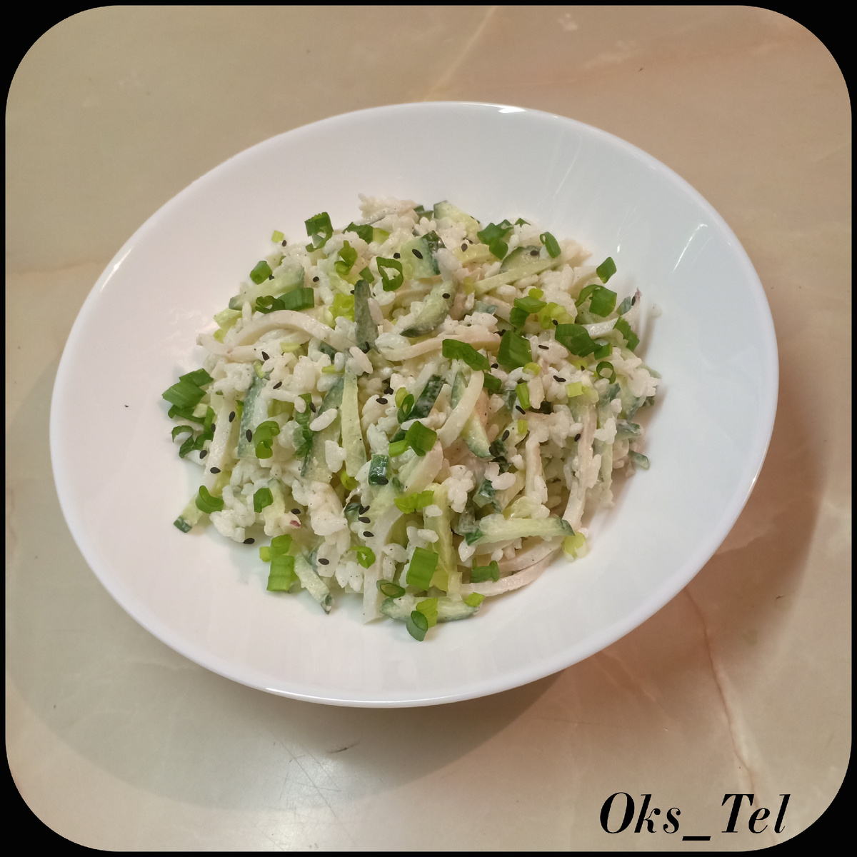 Довольно простой в приготовлении, легкий, но очень сытный, вкусный, и, по-весеннему свежий салатик понравится всем любителям кальмаров. Понадобится: - 400г кальмаров, - 200г свежих огурцов, - 100г риса, - 2-3ст.л. майонеза, - соль - по вкусу, - перец черный молотый - по вкусу. Приготовление: 1. Очистить тушки кальмаров от внутренностей, положить в кипящую подсоленную воду на 2-3мин (пока они не побелеют и шкурка не свернется). Затем вытащить их из воды, дать немного остыть, счистить ножом оставшуюся свернувшуюся шкурку и тушки кальмаров нарезать соломкой. 2. Рис отварить в подсоленной воде, промыть, откинуть на дуршлаг и дать стечь лишней жидкости. Рис должен получиться рассыпчатым. 3. Огурцы вымыть, обсушить и нарезать соломкой. 4. В глубокой миске соединить кальмары, огурцы и рис. Добавить соль, перец, майонез и все хорошо перемешать. Приятного аппетита!