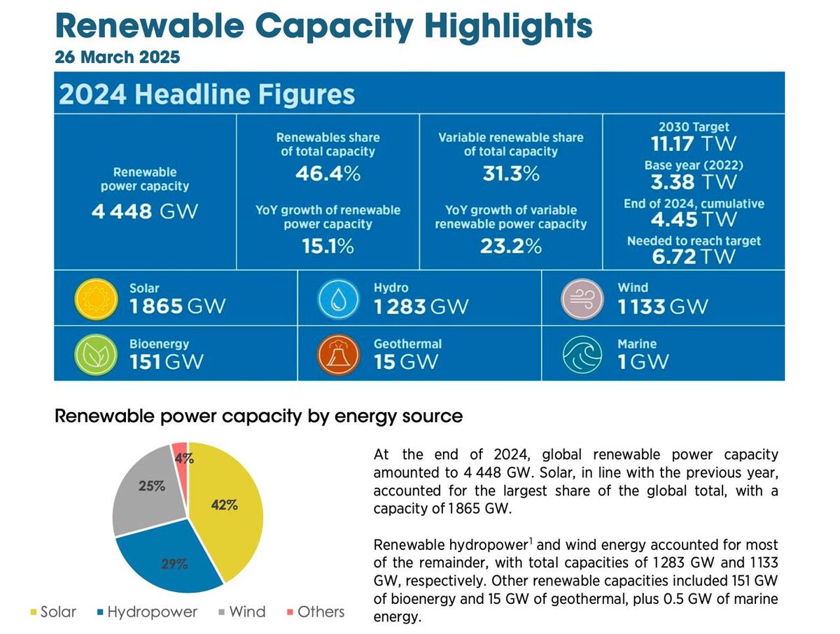С Днём Солнца! Традиционно 3 мая отмечается день нашей звезды - Солнца. Напомню, что без него не было бы жизни на Земле, потому что энергией Солнца в конечном итоге питаются все (см. статью про пищевую цепочку). И в этот день я хотел бы просто напомнить, что и в энергетике солнце отыгрывает немалую роль. Не буду приводить косвенных примеров, таких как формирование угля и нефти непосредственно из растений, которые питались солнечным светом или перемещения воздушных масс из-за того, что где-то они нагреваются больше, а приведу только данные IRENA (Международное агентство возобновляемой энергетики). Согласно последнего отчёта, ВИЭ на 2025 год занимает 46,4% всех установленных мощностей энергетики (4,45 ТВт) и солнце из этого объёма - 42% или 1,87 ТВт установленной мощности. Так что то, чем мы занимаемся и интересуемся - важно и нужно. С праздником! И напомню, что два года назад я даже делал праздничный спэшл подкаста по этому поводу. Можно его переслушать в такой день ;) @solarnews #