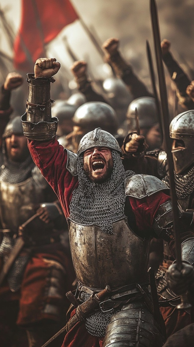 Создано на основе запроса: A group of medieval soldiers in full armor cheering and raising their fists, wearing 15th-century European plate armor, faces lit with excitement and renewed morale, dramatic battlefield lighting, historical realism, no modern elements --- Автоперевод: Группа средневековых солдат в полных доспехах, подбадривающих и выращивая кулаки, одетый в европейские доспехи 15-го века, лица, зажженные волнением и обновленным моральным духом, драматическое освещение на поле боя, исторический реализм, без современных элементов Круто выглядит? 🤔 https://dzen.ru/id/65c0c65c86e4f837c27b24d7 #ИИ #AI #нейросеть #midjourney #art