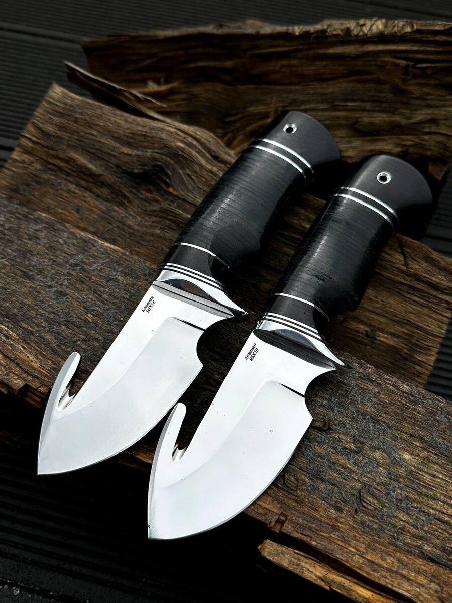 Два профессиональных шкуросъемных ножа сейчас свободны с крюком для вспарывания. Сталь на ножах выполнена из 95х18, довольно прочная и легко будет заточить в полевых условиях. Рукоять на обоих ножах выполнена из наборной кожи. Анатомическая форма рукояти. Нож заточен в бритву. Твердость каждого клинка (HRC): 58 Цена за один нож: 8.840 рублей, со скидкой: 7.072 рубля В комплекте идут ножны из натуральной кожи. Можем сделать формованные ножны +8000 рублей. Для заказа писать на @Nazarklinokbot или по тел +79101343831 WhatsApp/Viber