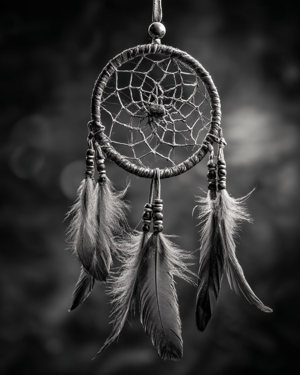 Создано на основе запроса: black and white highly detailed image of a Native American dreamcatcher, intricate woven web, hanging from leather cords, adorned with beautiful feathers, a few feathers with subtle touches of red, fine beadwork, high contrast lighting, studio photography, dark background, soft shadows, atmospheric, symbolic and elegant --- Автоперевод: Черно -белое очень подробное изображение коренного американца -сновидника, замысловатой тканой сети, висящей на кожаных шнурах, украшенных красивыми перьями, несколькими перьями с тонкими штрихами красного, тонкого изделия из бисера, высокого контрастного освещения, студийной фотографии, темным фоном, мягкими тени, атмосфера, символического и элегантного Неплохо получилось? 🤔 https://dzen.ru/id/65c0c65c86e4f837c27b24d7 #ИИ #AI #нейросеть #midjourney #art