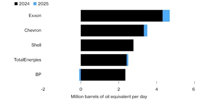 Ведущие западные нефтедобытчики упорно держатся за свои планы роста, несмотря на то, что в апреле нефть подешевела на 16%, а ОПЕК+ может еще больше нарастить добычу Производственные планы нефтяных компаний. Источник: Bloomberg Exxon Mobil, Chevron, Shell и TotalEnergies отчитались за первый квартал и не стали менять свои инвестиционные планы. Лишь BP пошла на сокращение расходов, уступив давлению активистского фонда Elliott Investment Management. Нефтяные гиганты проявляют упрямство в момент, когда рынок явно перенасыщен. Цены упали до минимума за четыре года из-за тарифов, которые ослабить подорвать мировую экономику и снизить спрос на энергоносители, а также после неожиданного решения ОПЕК увеличить добычу в прошлом месяце. Предложение может вырасти еще больше. По словам делегатов, ключевые страны ОПЕК+ обсуждают дополнительное увеличение добычи примерно на 400 000 баррелей в день в июне — этот вопрос будет решаться на виртуальном заседании в субботу. Готовность крупных нефтяных комп