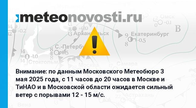 Внимание: по данным Московского Метеобюро 3 мая 2025 года, с 11 часов до 20 часов в Москве и ТиНАО и в Московской области ожидается сильный ветер с порывами 12 - 15 м/с. Перейти на сайт Прогноз погоды на 14 дней