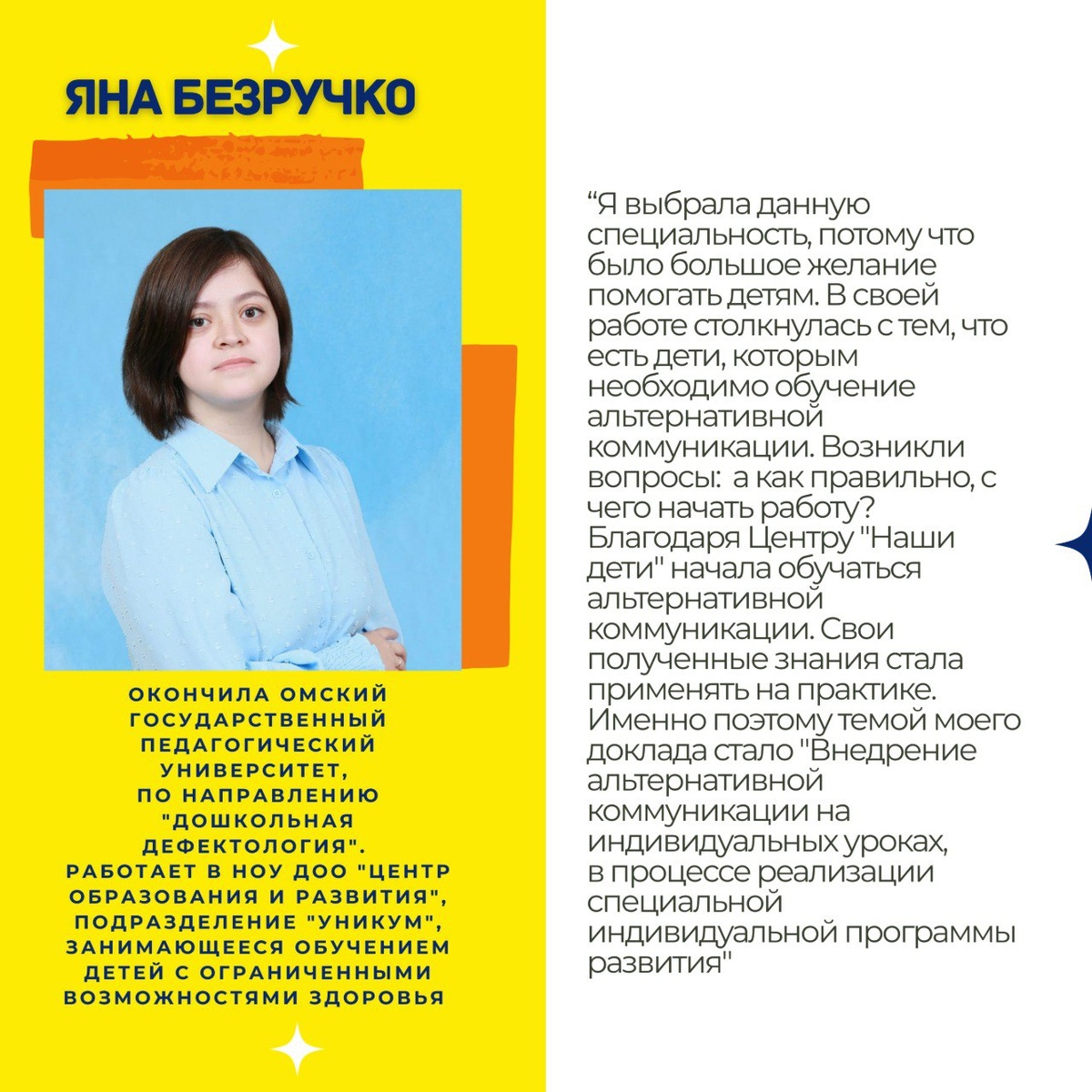 ⚡ Продолжаем знакомить вас с программой и спикерами нашей конференции по альтернативной коммуникации! Яна Безручко с докладом: «Внедрение альтернативной коммуникации на индивидуальных уроках, в процессе реализации специальной индивидуальной программы развития». В своем выступлении Яна расскажет о значении и роли альтернативной коммуникации в образовательном процессе и поделится личным опытом внедрения данной методики на индивидуальных занятиях. 💛 Ждем всех заинтересованных на нашем мероприятии, где каждый найдет полезную и важную информацию для своей профессиональной деятельности и личного роста! Напоминаем, что 📲 регистрация доступна по ссылке: https://goo.su/D0BeT 🗓 Дата: 27 мая ⏰ Время: 10:00–14:30 📍 Место проведения: Омск, Адаптивная школа-интернат №17 (ул. Энергетиков, 64) ❗Мест осталось совсем немного.