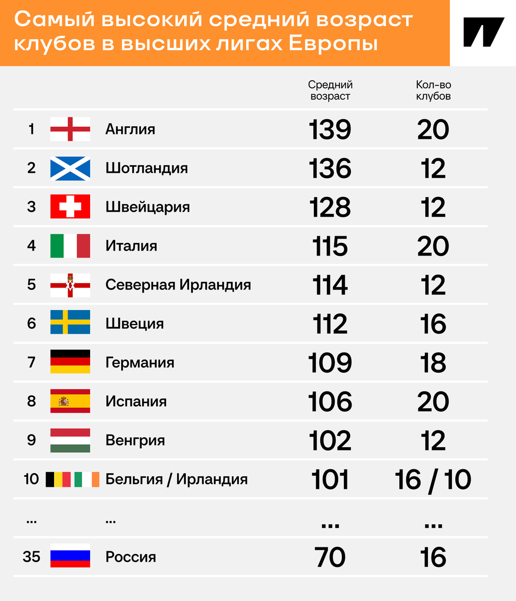 ● Только в Англии и Швейцарии все клубы в элитном дивизионе – с возрастом не менее 100 лет. В Шотландии – почти так, не вписывается только «Росс Каунти» (96).
