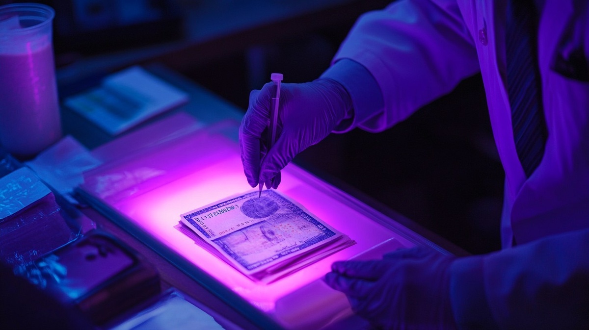 Создано на основе запроса: A counterfeit bill being detected under UV light by a bank employee in Japan, high detail, realism