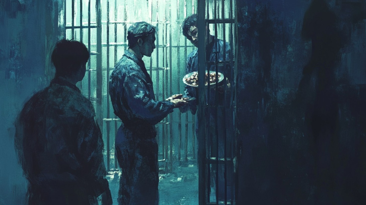 Создано на основе запроса: A guard handing extra food or favor to an inmate in a Japanese prison, sense of hierarchy, realism