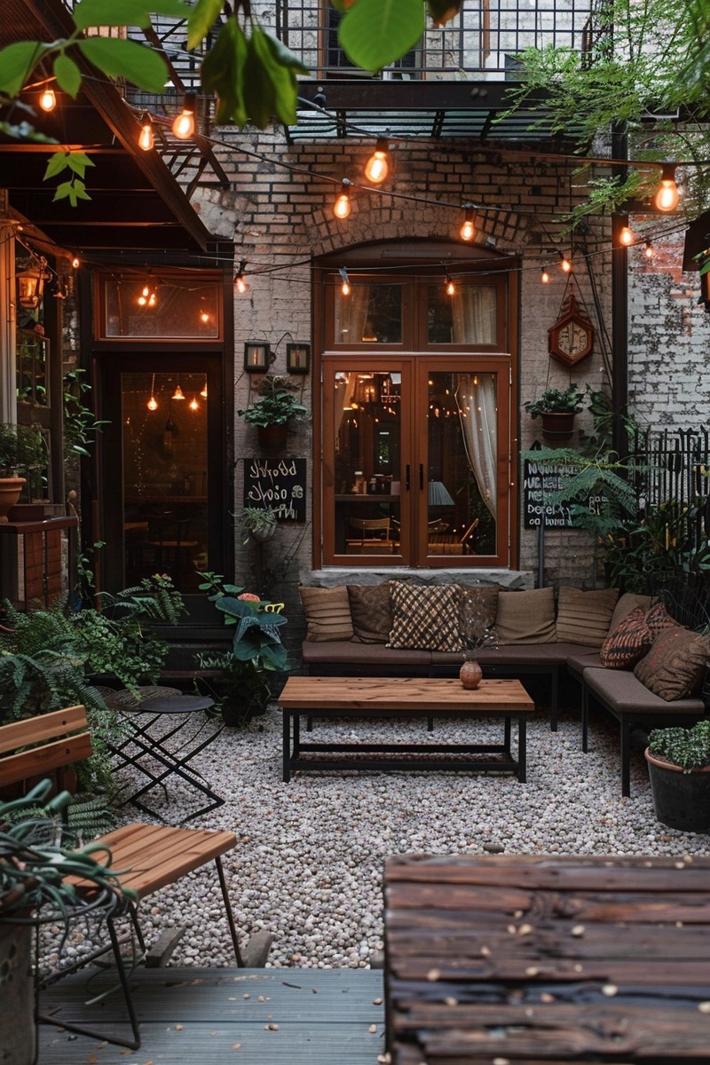 Создано на основе запроса: Show how salvaged outdoor seating area incorporated into a wabi-sabi apartment, used as functional architectural