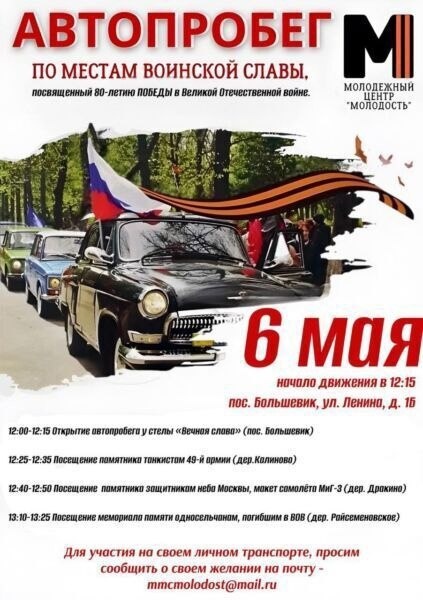 В Серпухове пройдёт автопробег по местам воинской славы 6 мая в честь 80-летия Победы в Великой Отечественной войне состоится автопробег по местам воинской славы. тарт пробега будет в 12.10 у Стелы «Вечная слава» в поселке Большевик. Всем желающим принять участие в автопробеге на своём личном автомобиле просьба сообщить о своём желании на почту mmcmolodost@mail.ru