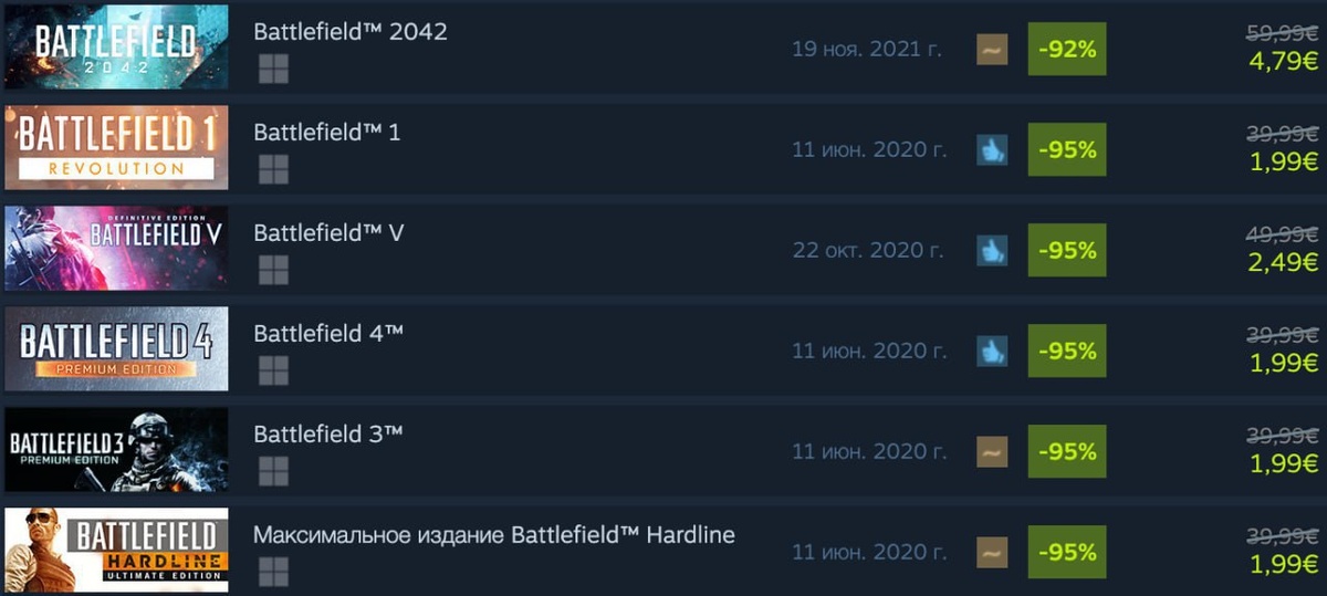 В Steam начались скидки на серию Battlefield Проекты получили скидки до 95%. Каждую часть шутера можно забрать за 130-260 рублей. Однако для покупки необходимо сменить регион. В российском Steam акция недействительна.