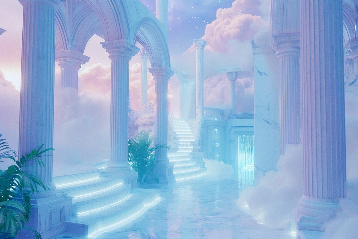 Создано на основе запроса: A hyper-realistic white marble temple floating in the cosmos, soft pastel lighting, high arches and columns