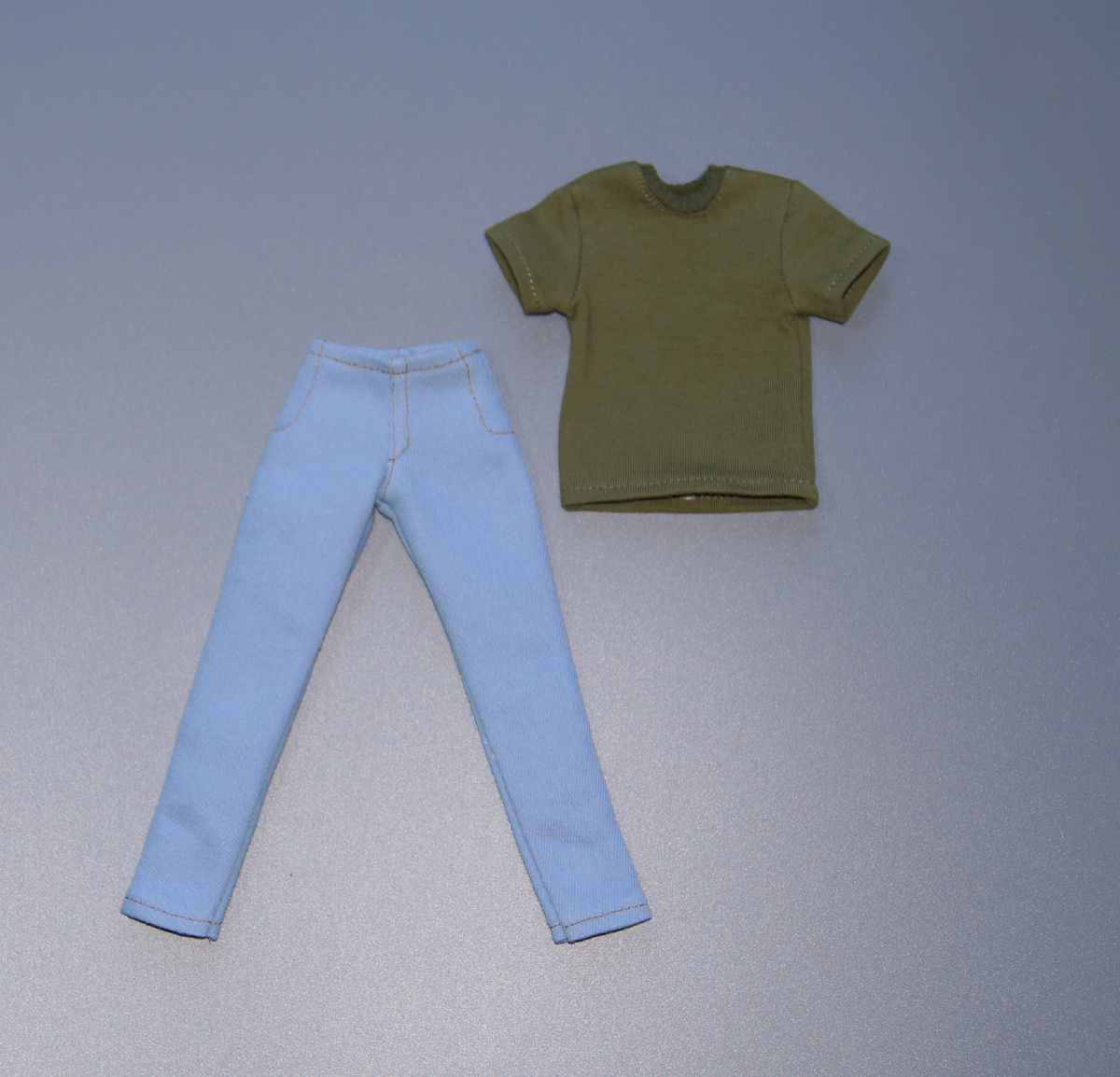Кен выходит и держит стиль, в духе «сегодня без суеты». Футболка из эластичного трикотажа цвета хаки. Джинсы — снова без карманов, но уже с кнопкой. Надёжные, как дружеское плечо.