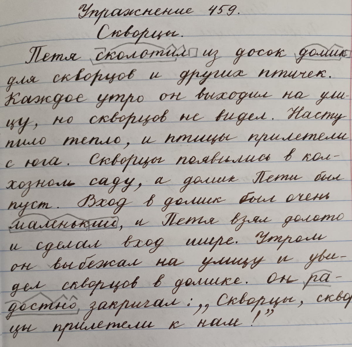 1. Проверка домашнего задания. 2. Актуализация знаний и объявление темы урока. - Что такое однородные члены предложения? - Что такое сложное предложение? Сегодня мы будем тренироваться расставлять запятые между однородными членами и простыми предложениями в составе сложного. 3. Работа по теме урока. Упр. 459. Прочитайте текст про себя. Вставьте вместо точек однородные члены предложения или простые предложения. Самостоятельно запишите свой текст. Проверка после самостоятельной работы. Прочитайте получившийся текст с запятыми. Примерный текст: Разберём по составу слова сколотил, домик, маленький, радостно. В последнем предложении найдите слова Пети. - Как они записаны? (С кавычками и с большой буквы). Упр. 460. Объяснительный диктант. После записи предложений подчёркиваются грамматические основы и объясняются запятые. Также проводится орфографическая работа. Упр. 461. Устно составим сложные предложения из простых. - Какие союзы можно использовать? (И, А, НО). Перед союзами обязательно