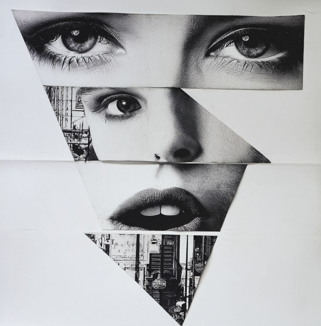 Создано на основе запроса: Geometric drawing of a woman's face, with the eyes and lips cut out into three pieces on a Rotcore