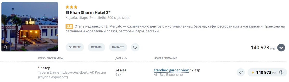 Давайте теперь посмотрим на стоимость туров в данный отель. Мы сделали подборку с вылетом из Самары на 2-х взрослых, 9 ночей, питание "все включено":