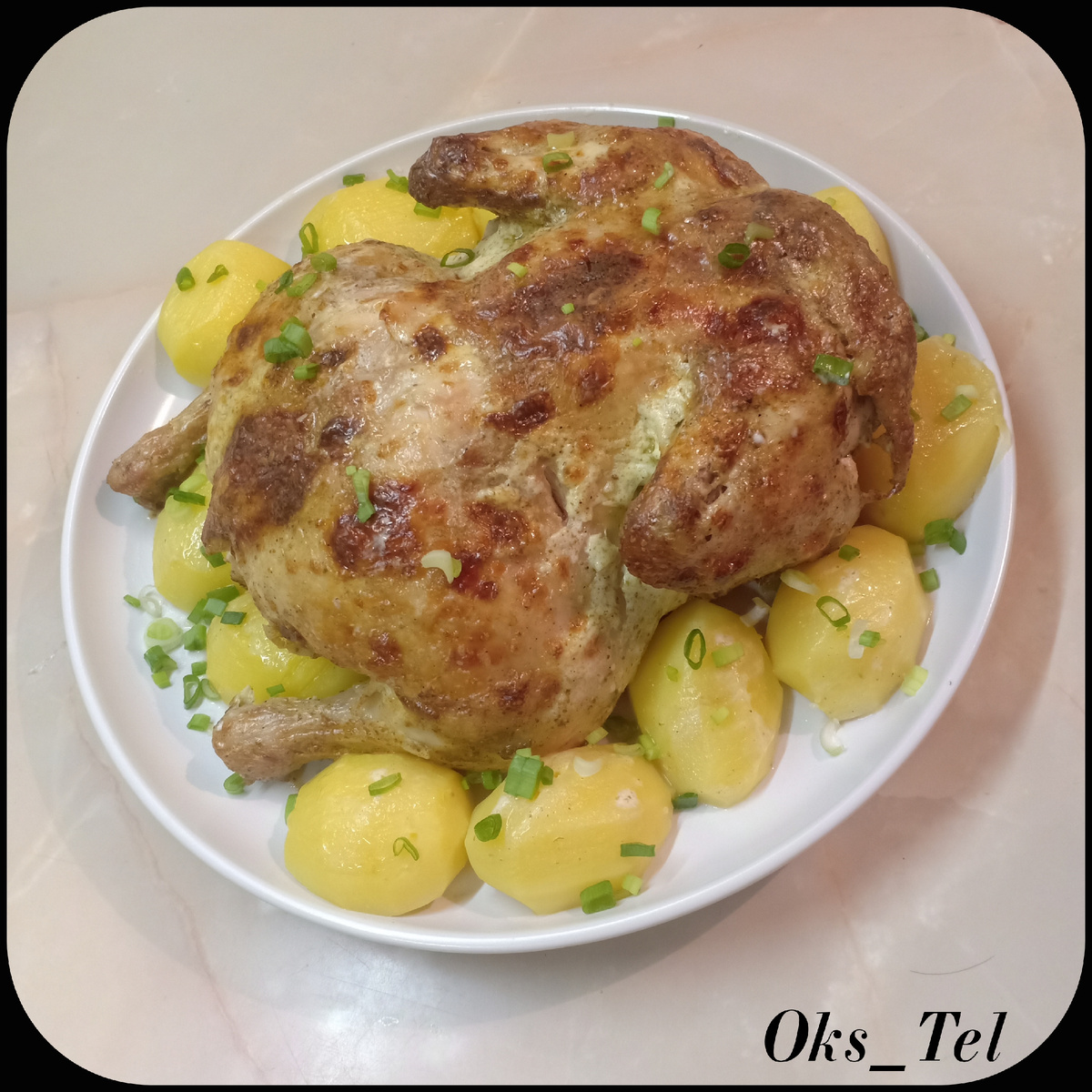 Вкусная и ароматная курочка с хрустящей корочкой и очень нежным мясом без лишних заморочек подойдет как для повседневного стола, так и для праздничного. Понадобится: - 1 курица, - 2-3 зубчика чеснока, - соль – по вкусу, - перец черный молотый – по вкусу, - 1ч.л. хмели-сунели, - 3ст.л. майонеза, - 3ст.л. сметаны. Приготовление: 1. Курицу хорошо промыть и обсушить. 2. Чеснок очистить и натереть на мелкой терке. 3. Тушку натереть солью, перцем, хмели-сунели и измельченным чесноком. 4. Натертую тушку завернуть в фольгу и поместить на противень в духовку. Запекать 30мин в духовке, заранее разогретой до 250С. 5. В отдельной мисочке смешать сметану и майонез. 6. Затем вытащить курицу из духовки, развернуть фольгу, смазать корочку майонезно-сметанной смесью и поставить обратно в духовку до образования поджаристой корочки и выделения прозрачного сока. Приятного аппетита!