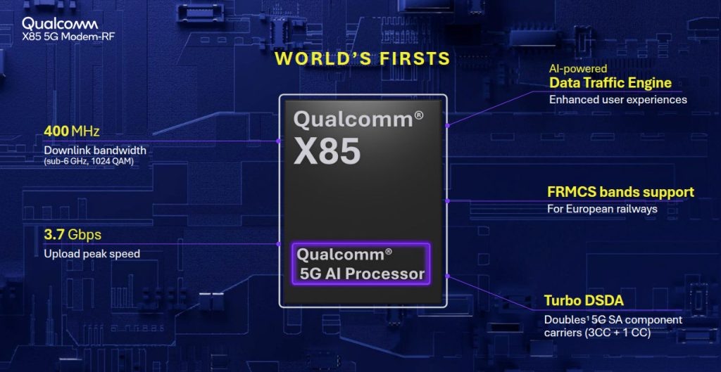 В марте на Mobile World Congress в Барселоне компания представила свой новый беспроводной модем для мобильных устройств X85, который поддерживает широкий диапазон сетей мобильной связи, высокие скорости и экономию энергии, для рабочих нагрузок ИИ. Максимальная скорость на входящем канале составит 12,5 ГБит/сек., на исходящем 3,7 ГБит/сек. Qualcomm X85 создан для мобильных приложений AI и в частности может использоваться для Android, получил положительный отзыв от Google.