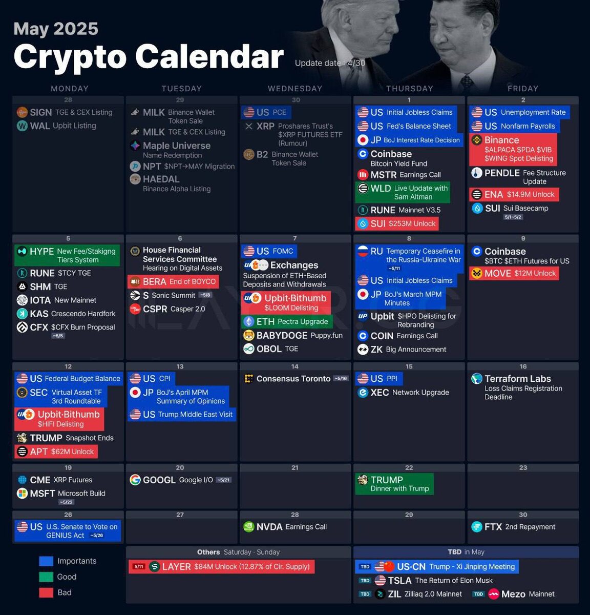 🗓Календарь на Май В мае нас ждет множество экономически и крипто событий, которые окажут влияние на рынок, вот самые главные из них: ⏺06.05 Комитет по финансовым услугам палаты представителей - слушания по цифровым активам ⏺07.05 Обновление ETH Pectra ⏺07.05 Заседание ФРС ⏺08.05 Заявки по безработице ⏺12.05 Баланс федерального бюджета США ⏺12.05 3-й Круглый стол SEC по вопросам криптовалюты ⏺12.05 Разлоки APT на $62 млн ⏺13-16.05 Визит Дональда Трампа на Ближний Восток ⏺15.05 Данные по ИПЦ ⏺22.05 Ужин холдеров TRUMP ⏺28.05 Второе погашение FTX ⏺27-29.05 Конференция Bitcoin 2025 в Лас-Вегасе 📥Сохраняйте календарь и заранее будьте готовы к важным событиям в мае.