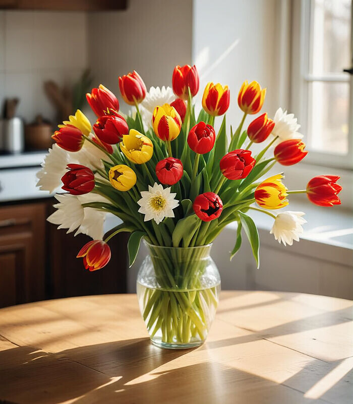 Знаете, как бывает: заходишь в цветочный магазин — и глаза разбегаются... Так хочется скупить все, собрать роскошный букет, но при этом не потратить годовой бюджет маленькой страны. Не переживайте, я тут, чтобы спасти вас от финансового краха и научить создавать шикарные композиции для дома. Фото: Freepik Ai, yapokupayu Тюльпаны — любовь с первого взгляда! Выбирайте их в ярких цветах — желтые, розовые, фиолетовые. Добавьте хризантемы — такое сочетание напоминает о теплых весенних днях и ярком солнце. Поставьте букет в высокую стеклянную вазу с широким горлом, чтобы все могли любоваться этой красотой. Фото: Freepik Ai, yapokupayu Если любите минимализм или не хотите заморачиваться, то вам подойдут кустовые розы и немного зелени. Разместите их в белой керамической вазе. Такой сет всем видом говорит за вас: «У меня есть стиль, но не хочу, чтобы композиция выглядела слишком навязчиво». Добавьте пару веточек эвкалипта — и готово! Стильно, просто и эффектно. Фото: Freepik Ai, yapokupayu Су
