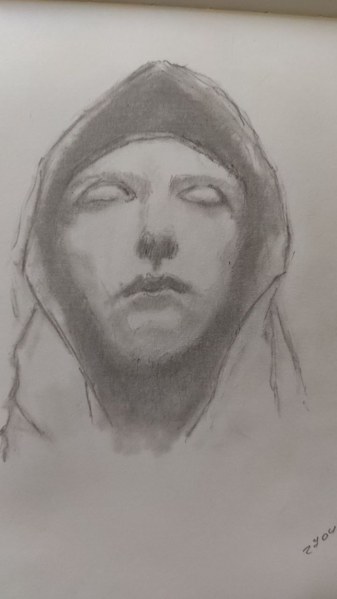 Монашка 6. На рисунке изображено лицо, выполненное карандашом. Лицо закрыто капюшоном, глаза закрыты или отсутствуют, создавая загадочное и мрачное впечатление. Картина выполнена в серых тонах, с мягкими тенями и контрастами. #художник #арт #рисунок #монашка
