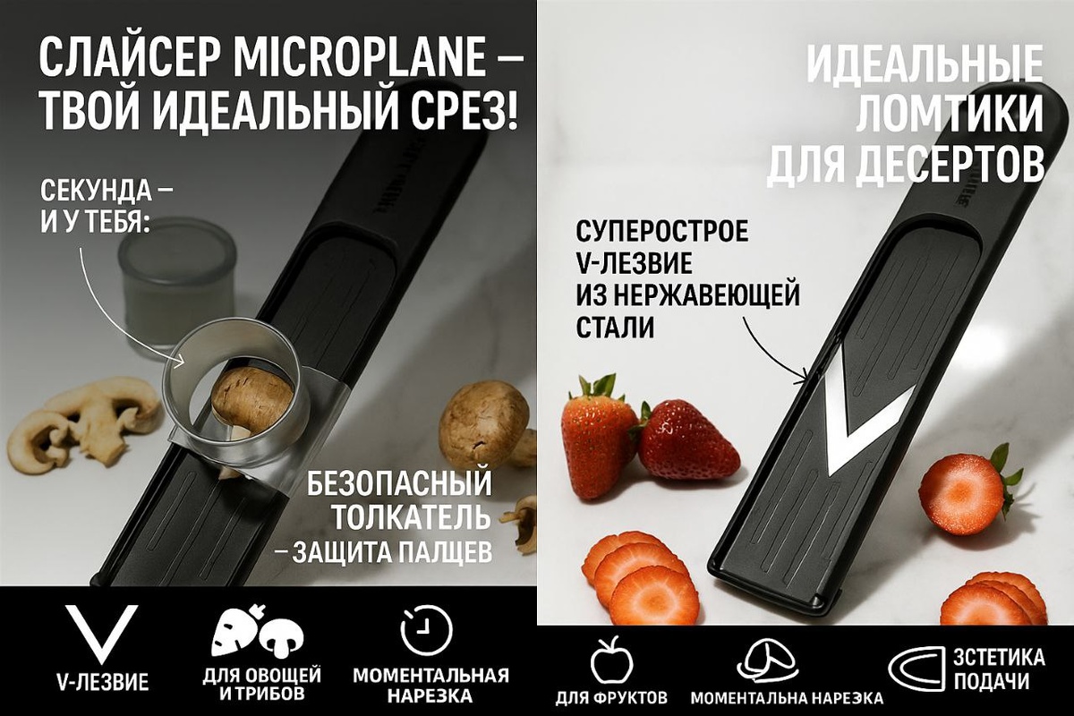 Забудьте про кривые ломтики и скучные нарезки! Эти слайсеры от Microplane — настоящее открытие для кухни. Тонкие, ровные, будто вырезанные лазером ломтики шампиньонов и клубники? Легко. Без слёз, без усилий, без риска порезаться. Один взмах — и у вас идеальный результат как в ресторане. V-образное лезвие из хирургической стали разрезает даже капризные продукты точно и мягко. А фирменный толкатель защищает пальцы — особенно удобно, если в доме дети. Microplane — это бренд, которому доверяют шефы. Теперь и вы. Овощи, фрукты, грибы — нарезка ещё никогда не была такой быстрой и красивой. Хотите готовить эстетично и легко? Слайсер Microplane — must-have для тех, кто ценит вкус, стиль и безопасность.