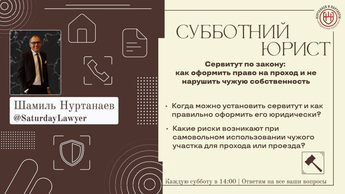 🔴🔴🔴🔴🔴 Сервитут мешает пользоваться участком? Юридические решения и порядок действий Сегодня 3 мая в 14:00 вы узнаете ответ на этот и на многие другие вопросы на трансляции "Субботнего Юриста" ⚖️ Эфир проведет юрист с 20 летней практикой – Шамиль Нуртанаев (нажав на имя вы можете узнать о юристе больше). 📝 Вот основные вопросы, которые мы обсудим в эфире: 1. В каких случаях возможно изменение установленного сервитута? 2. Что делать, если сервитут ограничивает права собственника? Также, каждый может задать свой вопрос любым удобным для вас способом, перейдя по ссылке: https://clck.ru/3ByDxh Или же просто напишите вопрос в комментариях к посту Получите юридическую консультацию, не выходя из дома! 🎥 Записи эфиров на нашем Rutube: https://rutube.ru/channel/40148985/ VK Видео: https://vk.com/video/@vk.nurtanaev Дзен: https://clck.ru/3DQGpA ✅ Присоединяйтесь к эфиру сегодня 3 мая 2025 года в 14:00, будет интересно: https://t.me/SaturdayLawyer