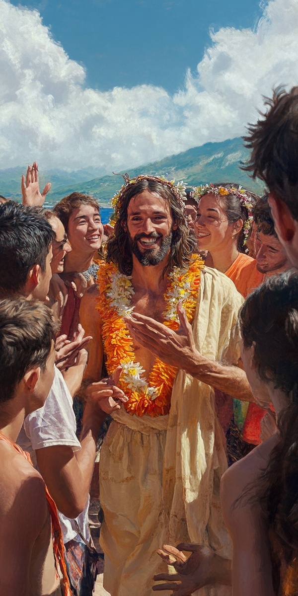 Создано на основе запроса: photorealistic Christ among several hawaiian college students welcomes us to join them