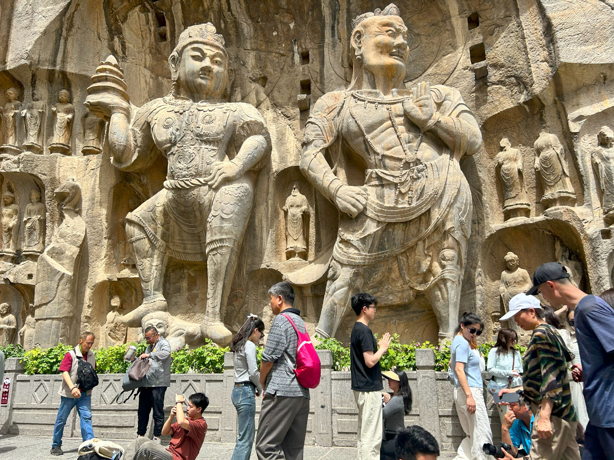 Побывать в Лояне и не посмотреть на гроты - преступление. Для меня это была одна из самых приятных экскурсий, которую рекомендую всем посещающим этот город. Почему: красиво, интересно, просторно, никаких очередей, недорого. Это очень приятная, живописная прогулка. Гроты представляют из себя более 2 тысяч фигур божеств, высеченных в скале. Это примерно километр созерцания древнего искусства. Высекать их начали еще в конце V века! Разных форм, размеров, есть небольшие храмы в скале. Гроты Лунмэнь (龙门石窟, Lóngmén Shíkū) Такси: ~20-30 юаней от ж/д вокзала (15–20 мин). Скажите: «请去龙门石窟» (Qǐng qù Lóngmén Shíkū). Автобус: № 81 от остановки у вокзала (40 мин). Цена: 90 юаней Пройдя на территорию, оказываетесь на широкой набережной, по правую руку - гроты. К группе фигур поднимаетесь по лестницам, попадаете на небольшие видовые площадки. На самой набережной есть лавочки, ларьки с закусками, напитками, мороженым, сувенирами. Местность открытая, поэтому лучше сразу взять с собой головной убор,