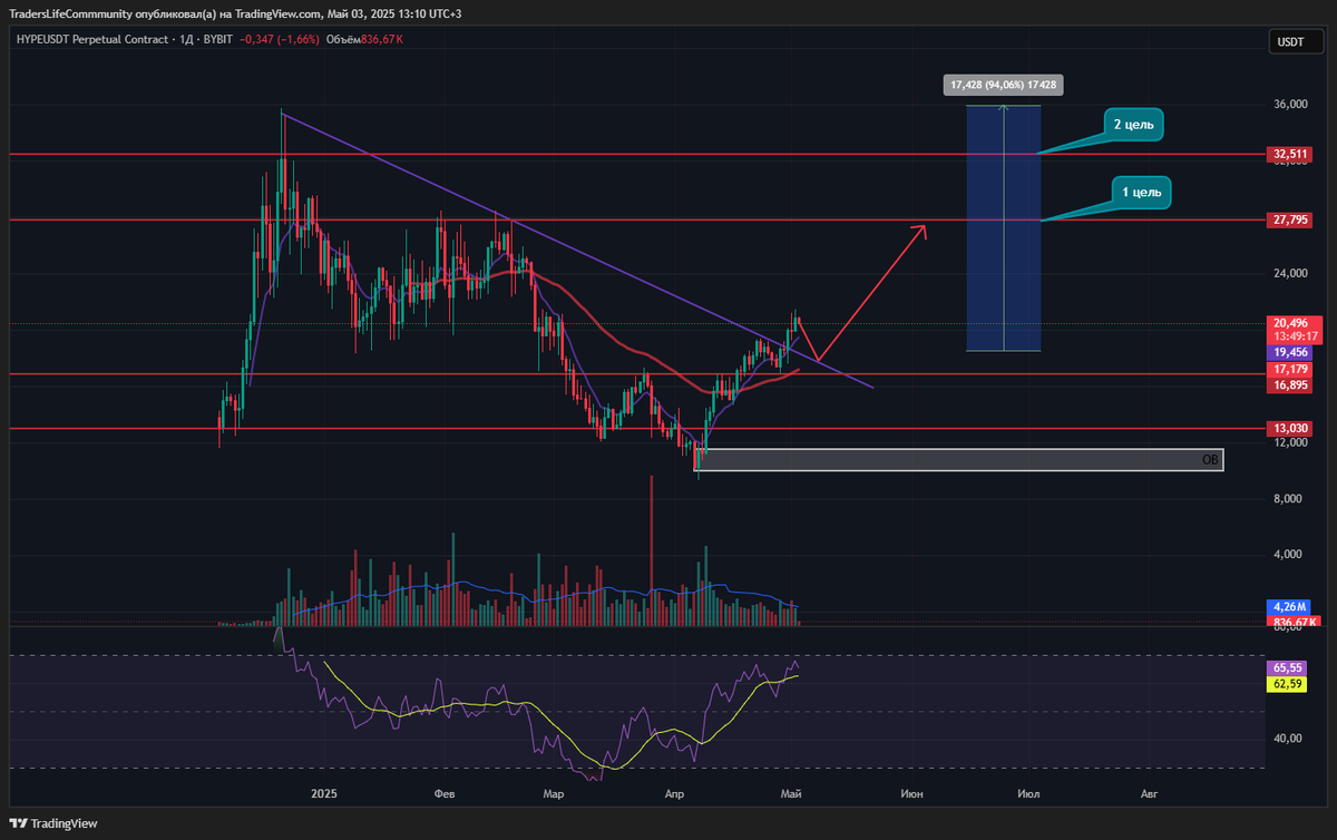 Монета пробила нисходящую наклонку. Сейчас ожидаю ретеста пробитой линии с последующим подтверждением разворота и полноценным выходом вверх. Первая цель, ключевой уровень 27,7. Если цена преодолеет его без существенных коррекций, высока вероятность скорого обновления ATH.