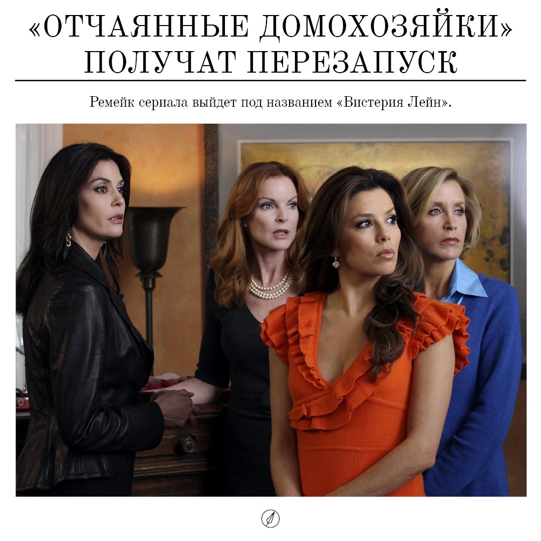 Киностудия Onyx Collective снимет ремейк сериала «Отчаянные домохозяйки». Название перезапуск позаимствует у вымышленной улицы, на которой жили главные героини оригинальной истории — «Вистерия Лейн». Сценарием перезапуска займётся Натали Чейдез («Бортпроводница», «Герои»), а продюсировать картину будет Керри Вашингтон. Новый сериал описывают как «веселую, сексуальную, трагикомедийную мелодраму / детектив» — в лучших традициях телешоу от ABC: Действие сериала разворачивается вокруг пяти заклятых подруг, которые живут на кажущейся безупречной улице Вистерия Лейн. На первый взгляд, жизнь в пригороде действительно идеальна: ухоженные дома, благополучные семьи, блестящие внедорожники на подъездной дорожке. Но за белыми заборами и улыбками в соцсетях скрываются секреты. Кого ждать в главных ролях, пока неизвестно. Однако звезда сериала Ева Лонгория (Габи Солис) не раз отмечала, что если «Отчаянные домохозяйки» получат продолжение, она будет первой в очереди на камбек.