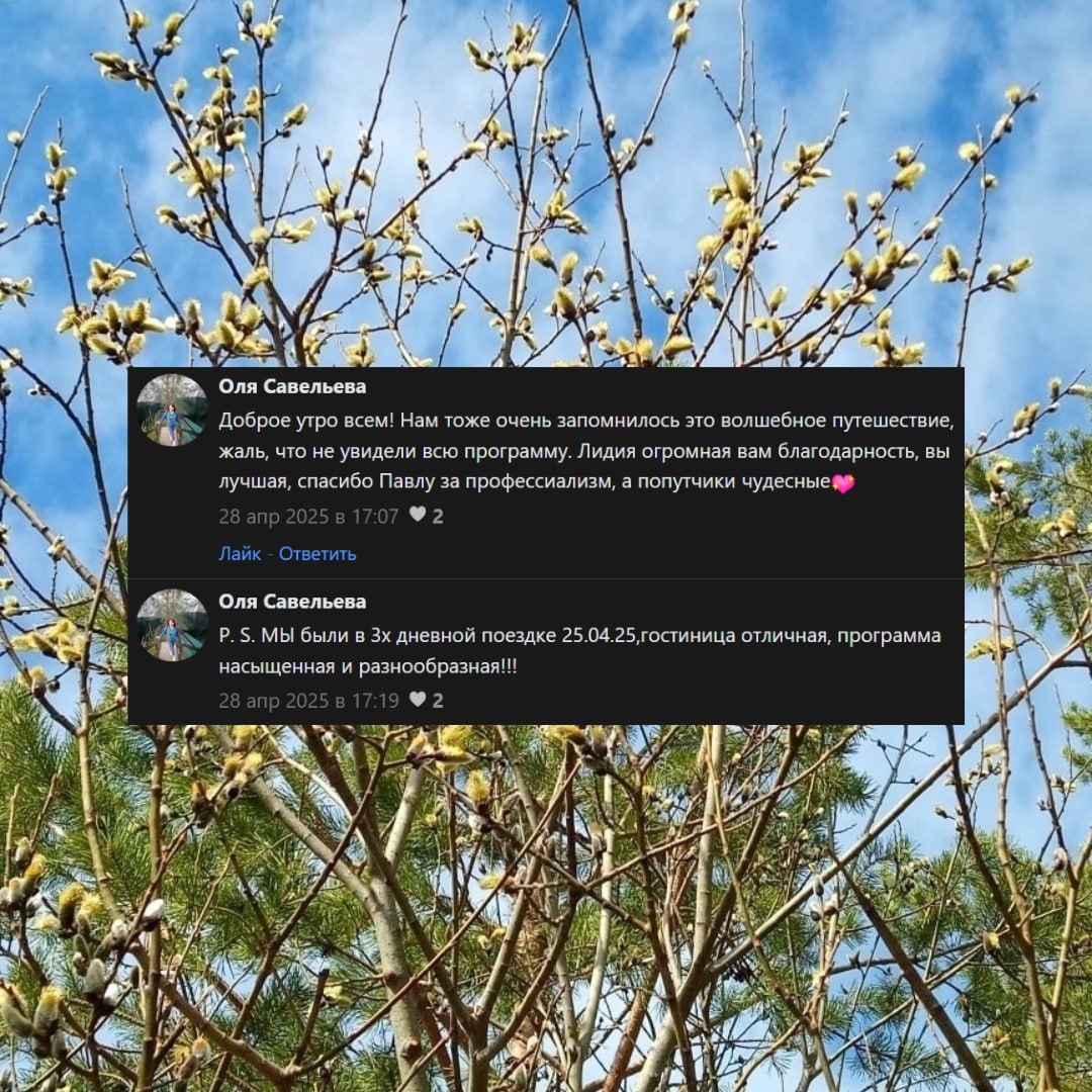 ❤️Всегда внимательно и с удовольствием читаем ваши отзывы. Спасибо, что доверяете нам свои время и отдых! Обратная связь помогает нам делать туры лучше 🙌🏻 ⚡️Больше отзывов можно найти в нашей группе в ВК в разделе обсуждений. ⚡️Поделиться своими впечатлениями можно в новом разделе отзывов или в поисковиках в описании нашей компании.