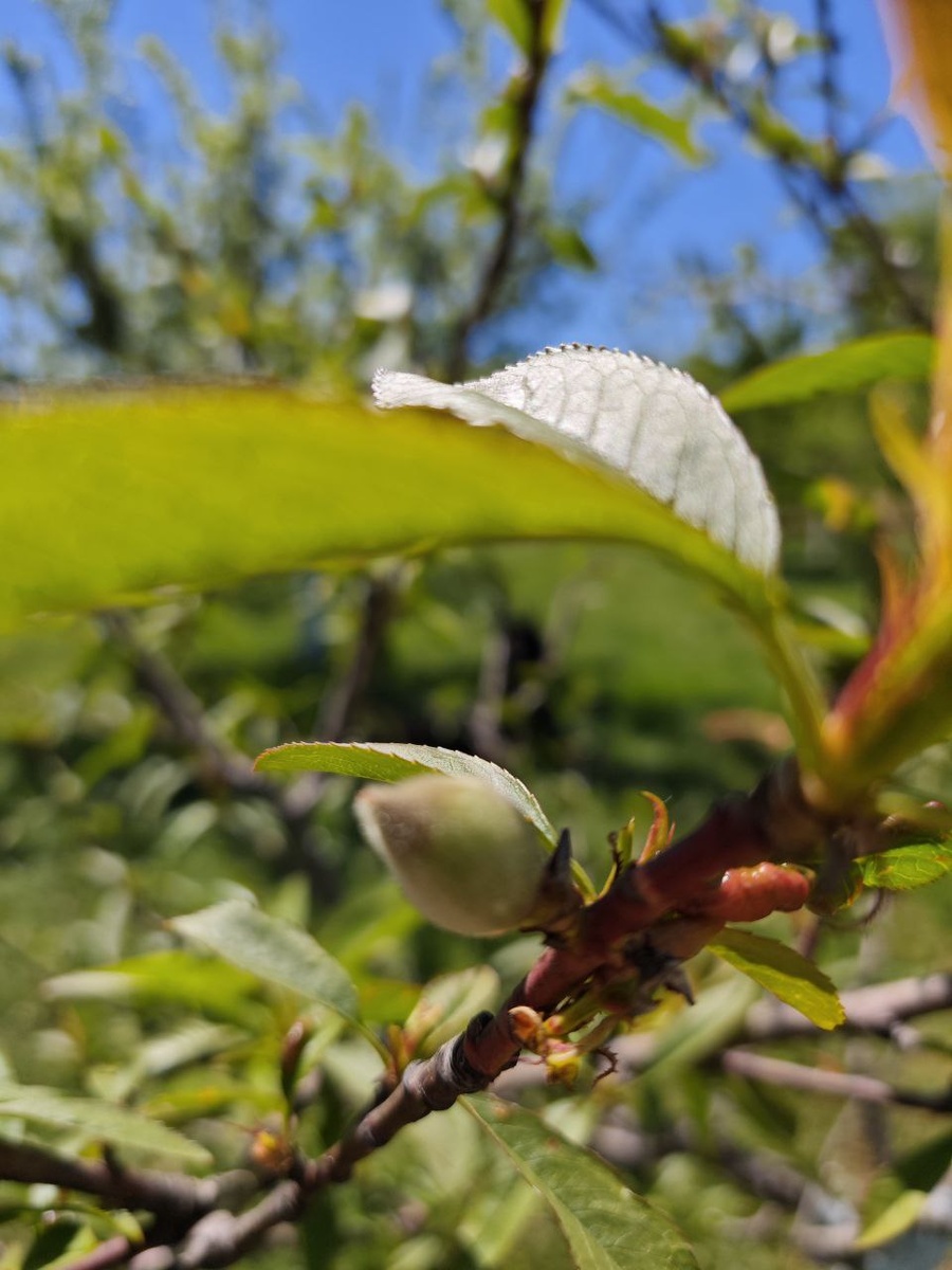 Сегодня утром +12 градусов Все вы видели персики, миндаль, черешню на прилавках магазинов. А видели ли вы их в младенчестве? Тогда, когда плод еще только завязывается. Сейчас самое время посмотреть на них. В нашем саду растут 2 персиковых дерева. Не смотря на то, что персик это крупный плод, деревья во взрослом возрасте низкорослые. Примерно с человеческий рост или чуть выше. Деревья очень подвержены грибковым заболеваниям. Каждый года мы с ними мучаемся и боремся. Листья закручиваются, покрываются красной корочкой. Это и есть грибок. От него практически не избавиться. Пролили актарой, через 2 недели повторим. Лечение надо прекратить за месяц до созревания плодов. А это малыши у черешни. Это слива. У нас только 1 дерево. Венгерка. Яблочки, конечно, видели все. У нас 4 яблони. Все разные: зимние и летние. Как называются сорта я не знаю, так как их сажал прежний хозяин. Абрикос. Довольно высокое дерево. Листья похожи на листья березы. Есть в нашем саду и орехи миндаль. 3 дерева,
