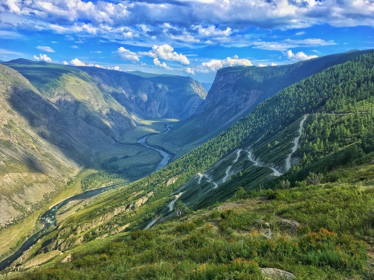 Название "Кату-Ярык" переводится как "теснина" или "ущелье". Общая длина спуска - чуть меньше четырех километров. И на это небольшое количество километров приходится аж 9 поворотов на 180 градусов. А перепад высот составляет 892 метра - это больше 2000 этажей, если измерять в домах. Представьте себе крутизну склона - если в градусах, то их 70 🤯 А если в ощущениях, то как будто вообще под прямым углом спускаешься. Никакого асфальта на спуске нет и в помине - грунт, да камни. Субъективное мнение - вообще нет. До Акташа ведет прекрасный Чуйский тракт с отличным покрытием. От Акташа до Улагана - дорога "ну ничего так". От Улагана до Кату-Ярыка вообще уже все равно на то, какая дорога, ведь красоты вокруг неописуемые. Если в километрах, то от поворота на Акташ до Кату-Ярыка - 100 км. Часа за три-четыре домчать можно. Примерно 3/4 приехавших не спускаются вниз. Смотрят сверху на долину Чулышман и перевал, делают фото и уезжают обратно. Есть небольшие юрты/кафе. Что-то строится. Сувениры пр