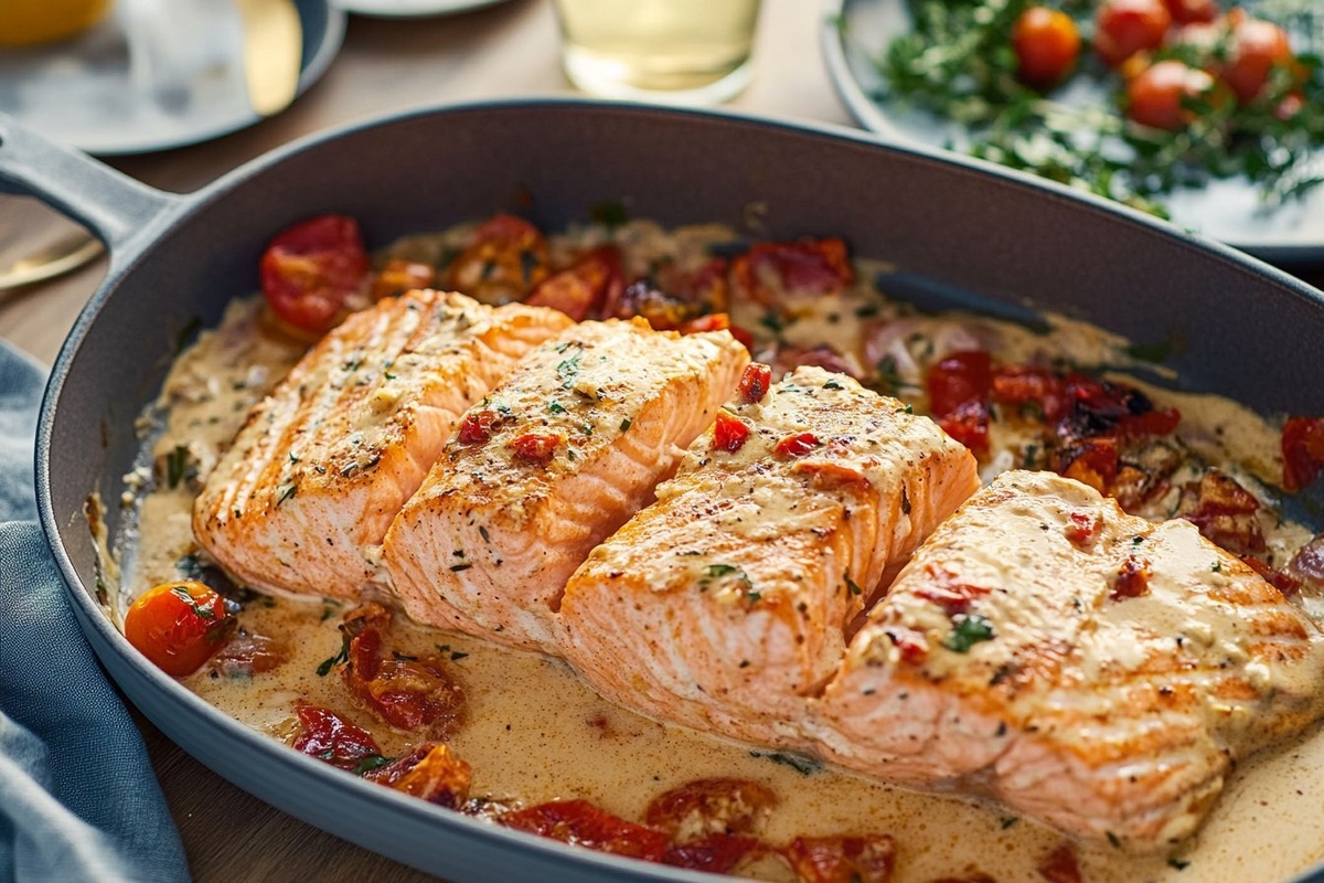 Создано на основе запроса: | Title: Marry Me Salmon | STYLE: Close-up Shot right view | EMOTION: realistic as possible | SCENE: KEYWORD | TAGS: High-end food photography, clear composition, mouth-watering, indulgent, gourmet, cuisine, recipe | CAMERA: Nikon Z7 | FOCAL LENGHT: soft direction light | PRODUCTION : food stylist | TIME : daytime | LOCATION TYPE : kitchen near windows,