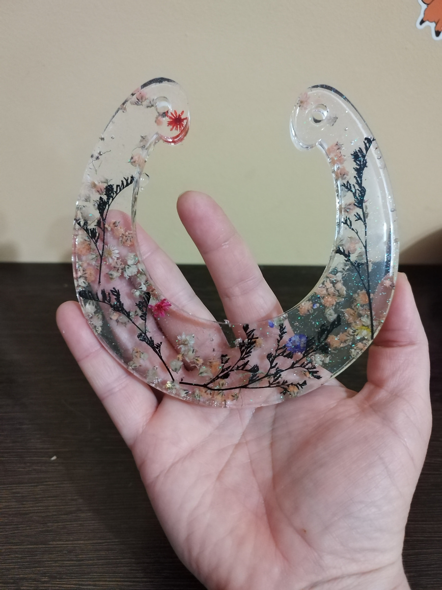 Красивая подкова у меня получилась! Давно хотела приобрести молд- подкову , купила как-то один , но она маленькая оказалась , в общем не то пальто , а вот эта мне послужит! Смотрите какой размер ! Отличный молд! Смолу беру средней вязкости. Замешивать нужно две части смолы с одной частью отвердителя , но я отвердителя добавляю самый чуток побольше , потому что бывала липкость изделии , что не есть хорошо. Решила сделать подкову прозрачной , добавила только очень мелкой зелёной блёстки . Выложила сухоцветы и от букета остались мелкие соцветия , я их не выбрасываю , всё идёт в ход. Заливаю молд не до конца , чуток оставляю бортик, травки и цветочки имеют вредность , они всплывают слегка , поэтому придётся заливать в два приёма. Заливка не до конца бортика , и вот видно как травушки вылезли на поверхность. После подливки и просушки вынула подкову , очень мне нравится! А вам? Привяжу к ней ленточку -бантик и кому-нибудь подарю!