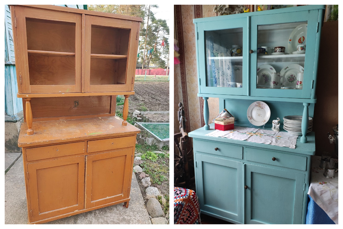 Сегодня наконец-то покажу свой буфет, который я привела в порядок. Не буду писать, что отреставрировала, это будет слишком громко сказано, так как муж его немножечко отшлифовал от множества слоёв добротной советской краски, вставил стёкла, а я покрасила его под цвет своей полочки.