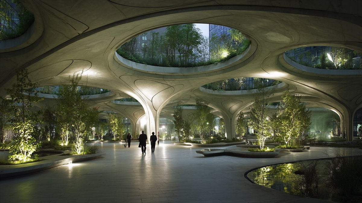 Создано на основе запроса: real photograph, columetric lighting, Zaha Hadid design forms, planted roofs and spaces, green urban design