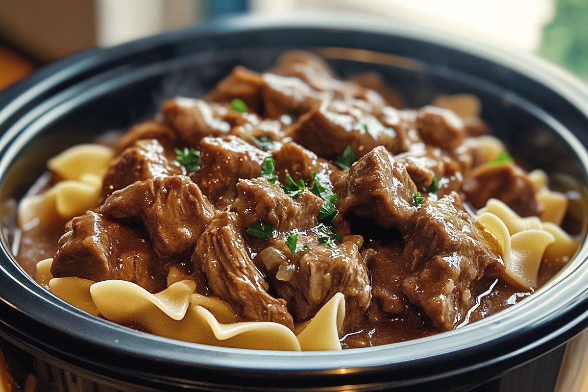 Создано на основе запроса: | Title: Crockpot Beef Tips and Noodles | STYLE: Close-up Shot right view | EMOTION: realistic as possible