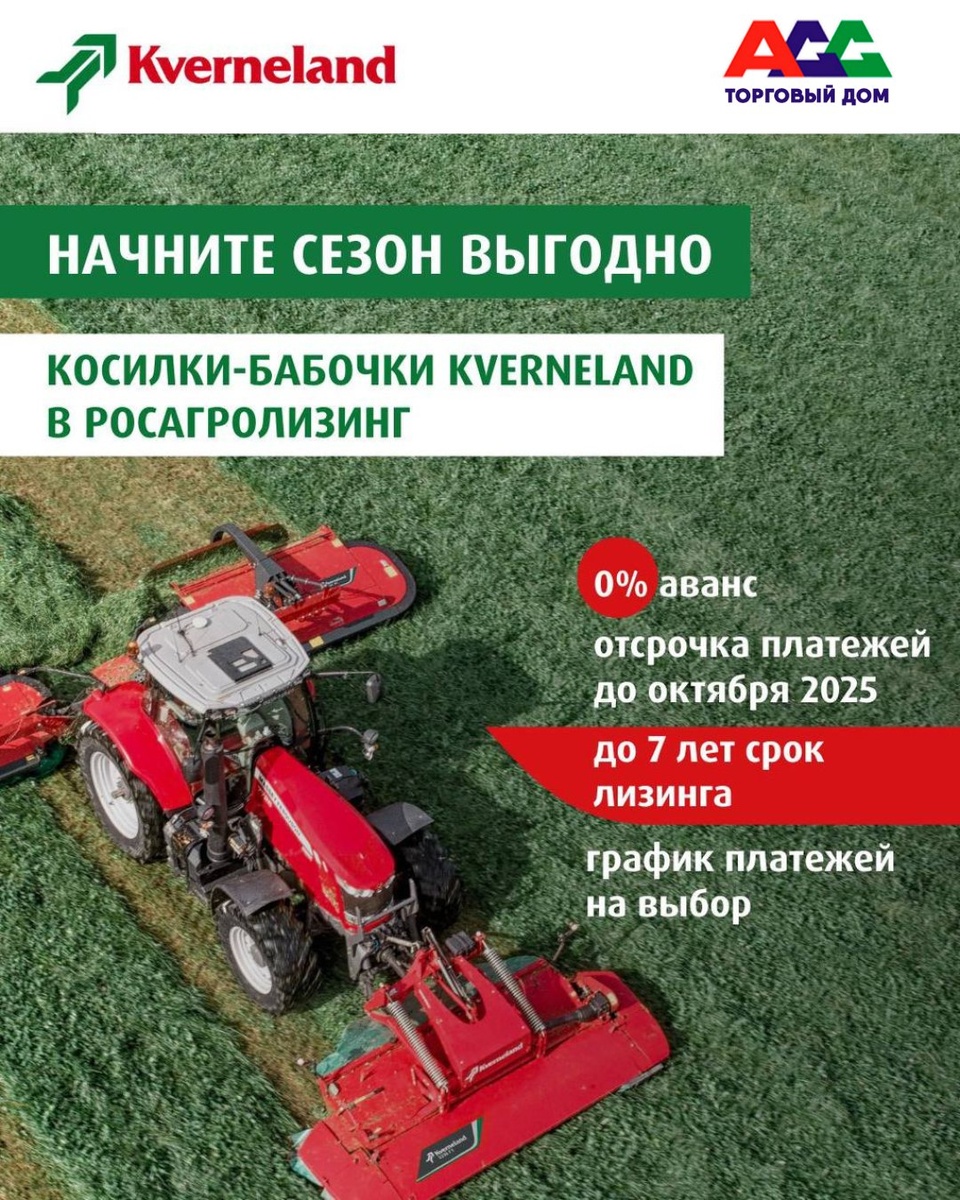 Делимся с вами долгожданной новостью 🔥 Теперь приобрести косилки-бабочки Kverneland можно еще выгоднее через «Росагролизинг»! Комбинации косилок Kverneland 3332 FT, Kverneland 5087 MT и Kverneland 5387 MT BX можно приобрести по специальным условиям: 🔸 Приобретайте машину к сезону прямо сейчас, а начинайте платить с октября 2025 года (максимальный срок лизинга по условиям акции — до 7 лет) 🔸 Выбирайте удобный тип графика платежей: аннуитетный, регрессивный, сезонный или сезонный график с индивидуальными настройками 🔸 Не переживайте за изменение стоимости техники — она останется неизменной на весь процесс сделки. Мы — официальный дилер Kverneland и предлагаем только проверенную и надежную технику. 📞 По всем вопросам звоните: +7 (831) 410-64-45