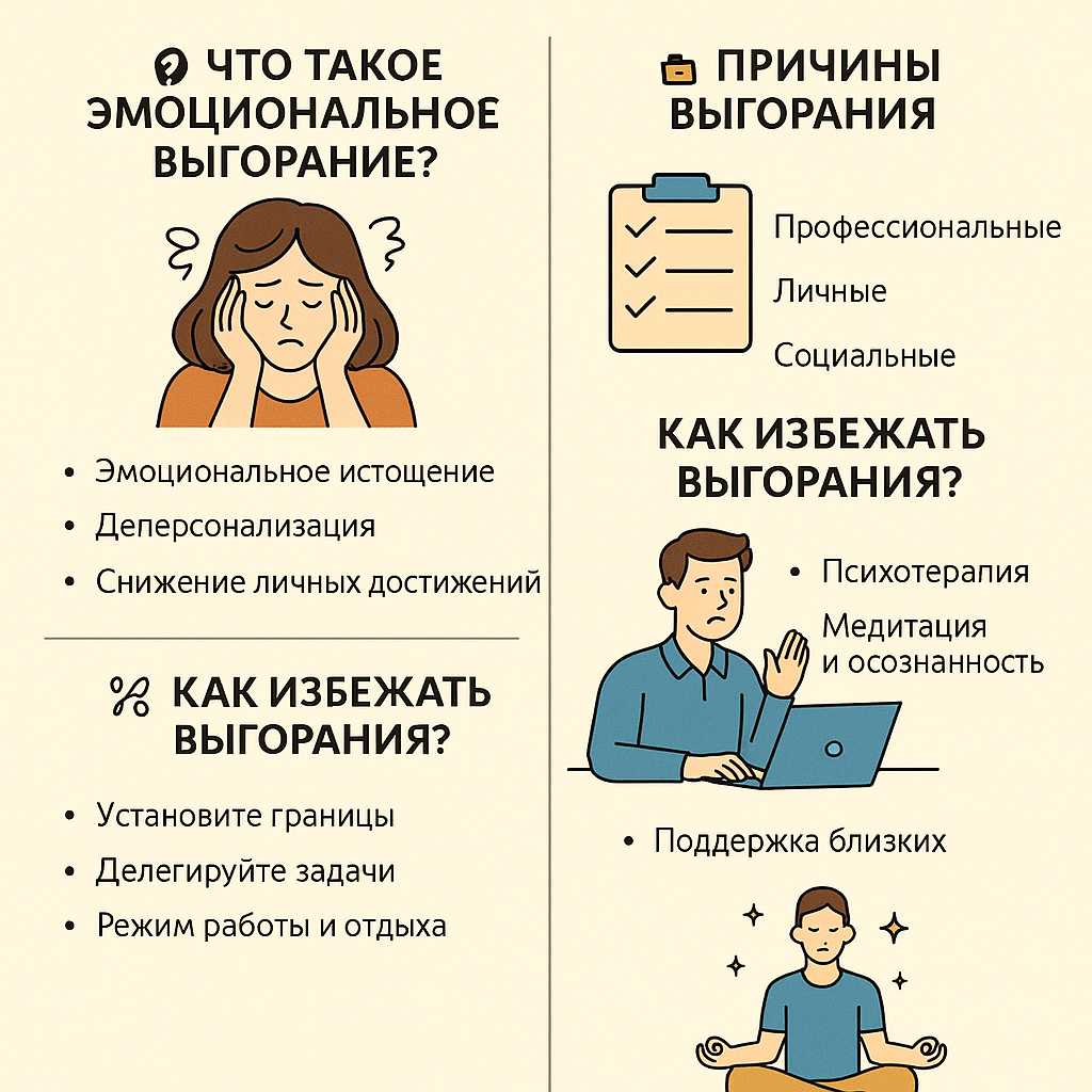 Эмоциональное выгорание — это не слабость, а важный сигнал, который нельзя игнорировать. Признавайте свои чувства, заботьтесь о своем психоэмоциональном состоянии и не бойтесь обращаться за помощью. Помните, что вы не одиноки в этом процессе, и восстановление возможно. Позаботьтесь о себе, и тогда вы сможете вернуться к полноценной жизни, где есть место не только для работы, но и для отдыха, радости и внутреннего мира.