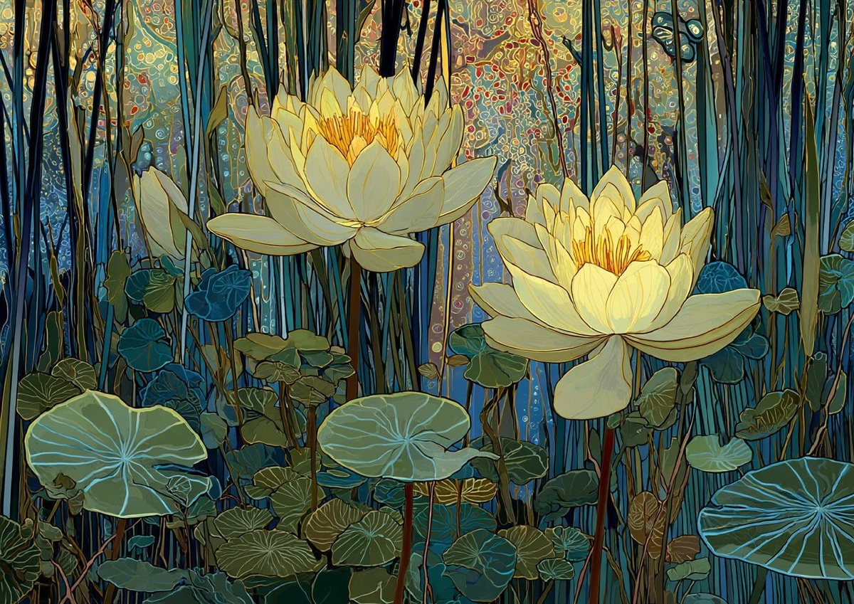 Создано на основе запроса: surrealist abstract, graphic fine art nouveau, luminescent lotus and waterlily and reeds, bright dusk background