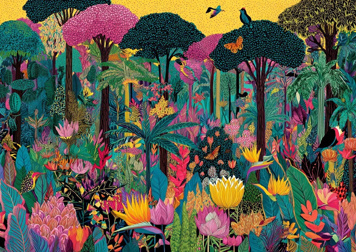 Создано на основе запроса: surreal colourful exotic jungle interior, inspired by Kusama and Matisse and Derain and Miro and Mary Blair, thin