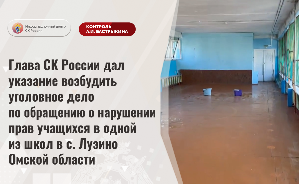 Глава СК России дал указание возбудить уголовное дело по обращению о нарушении прав учащихся в одной из школ в с. Лузино Омской области В комментариях в социальной сети в СК России обратилась жительница Омской области по вопросу нарушения прав учащихся в одной из школ в селе Лузино. Здание, 1921 года постройки, находится в непригодном для пребывания детей состоянии. В строении нарушена целостность кровли, помещения систематически затапливает. В результате в учебных классах распространилась плесень, что может негативно сказаться на здоровье несовершеннолетних. Многочисленные обращения родителей результатов не принесли. Председатель Следственного комитета Российской Федерации Александр Иванович Бастрыкин дал указание руководителю СУ СК России по Омской области Виталию Владимировичу Батищеву возбудить уголовное дело и доложить о предварительных и окончательных результатах его расследования. Исполнение поручения поставлено на контроль в центральном аппарате ведомства. #СледственныйКомитет